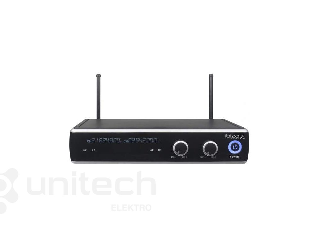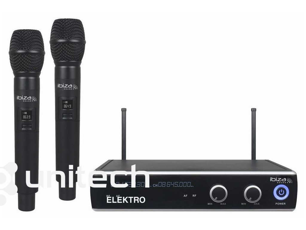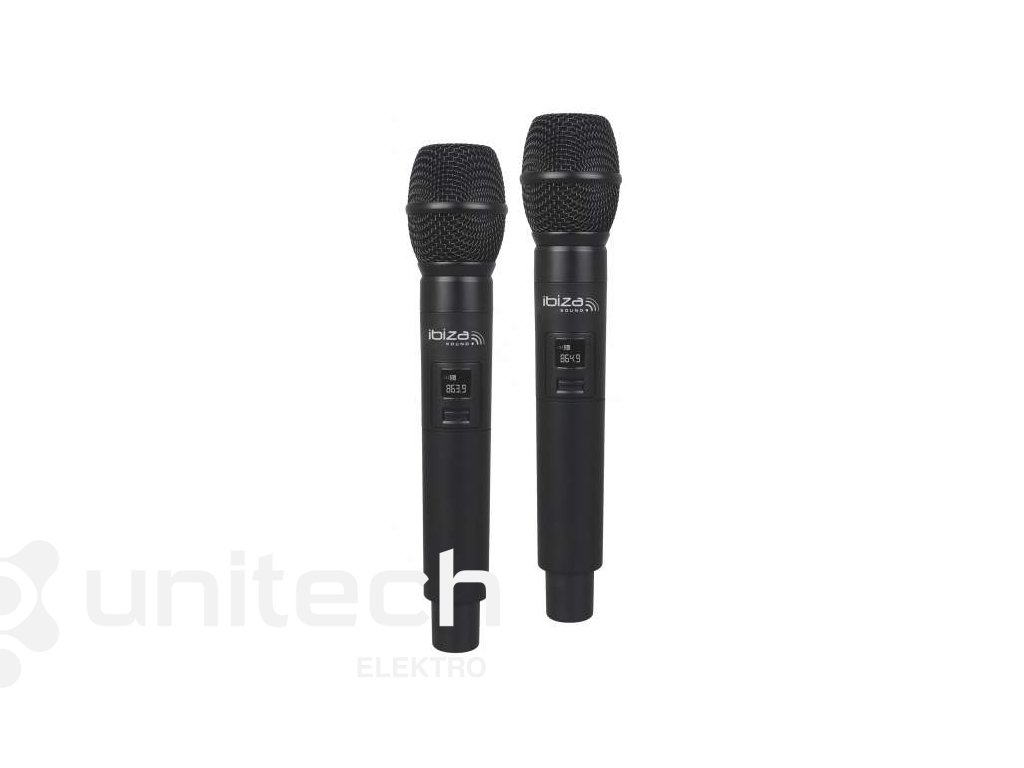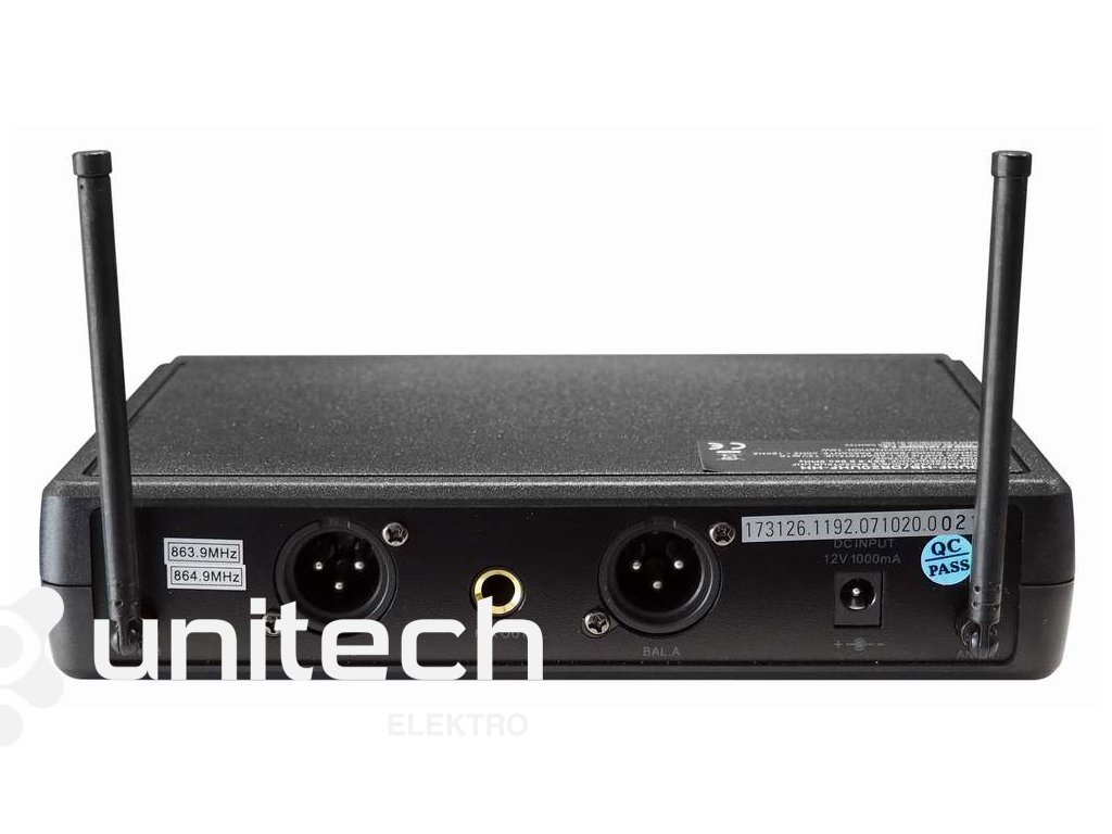 Set bezdrôtových UHF mikrofónov. Obsahuje 2x ručný mikrofón a prijímač. Frekvencie mikrofónov 863,9MHz a 864,9MHz. Vysielač je napájaný 2x 1,5V AA batériou. Dosah 60m. Samostatná regulácia hlasitosti pre každý mikrofón. Samostatný symetrický XLR audio výstup (400mV) pre každý mikrofón a nesymetrický zmixovaný Jack 6,3mm audio výstup (200mV). Mikrofón je ideálny pre spev a hovorené slovo.